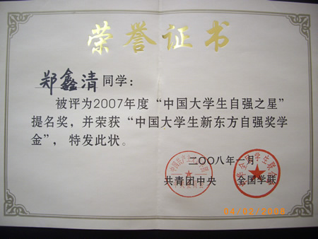 B04050628郑鑫清同学,荣获共青团中央和全国学联共同颁发的2007年度“中国大学生自强之星”提名奖和“中国大学生新东方自强奖学金”。