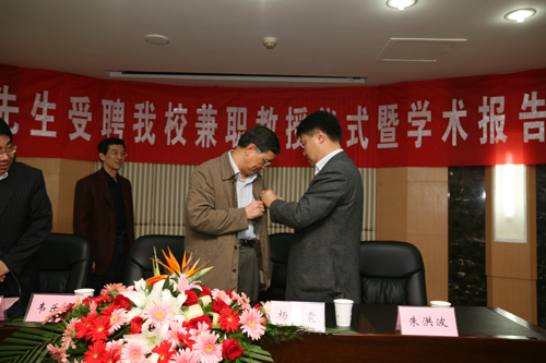 在黄维副校长的主持下,杨震校长郑重地向韦乐平先生颁发了兼职教授聘书,朱洪波副校长为其佩戴南京邮电大学校徽。韦乐平先生欣喜地发表了简短的受聘感言。他说,当一名大学教授是他自小就树立的理想,他表示,一定会珍惜这个荣誉,好好珍藏南京邮电大学的校徽,希望用自己的知识为南邮贡献微薄之力。