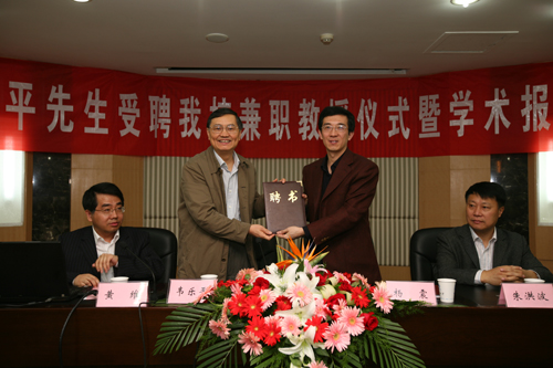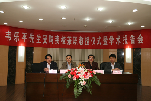 4月20日上午,我校科学会堂一楼演讲厅内座无虚席,韦乐平先生兼职教授受聘仪式在这里隆重举行。校长杨震、副校长黄维、朱洪波出席了受聘仪式。