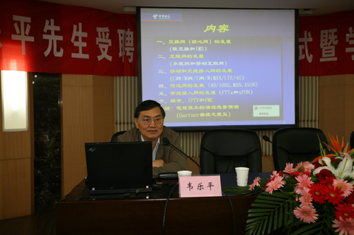 随后,韦乐平先生为我校200多名师生作了题为“电信网发展大趋势”的讲座。讲座共分为六个部分:一是交换网(核心网)的发展;二是互联网的发展;三是移动和无线接入网的发展;四是传运网的发展;五是有线接入网的发展;六是三网融合。在两个多小时的讲座中,韦乐平先生以一个个生动鲜活的事例,一组组详实有力的数据,给大家作了一个电信网发展的全景式扫描。其忘我的工作态度、渊博精深的学识、亲切随和的语言,深深地感染了在场的每一位听众,充分展现了一位通信专家的勤勉敬业、远见卓识和人格魅力。