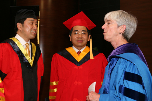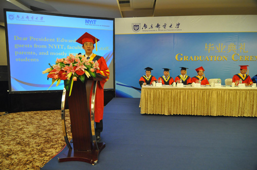 6月5日,南京邮电大学海外教育学院2011届学生毕业典礼在南京隆重举行。校长杨震教授,副校长黄维教授,江苏省教育厅国际合作交流处余晓南副处长,美国纽约理工学院校长Edward Guiliano博士、校董会主席Linda Davila女士,美国驻上海总领事Beatrice Camp女士等出席了毕业典礼。