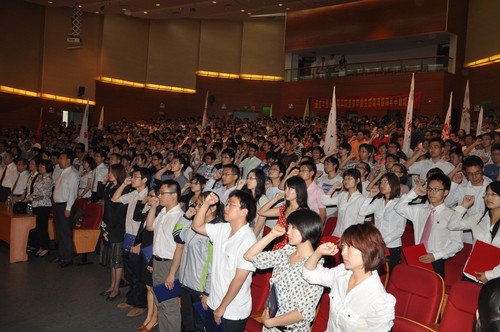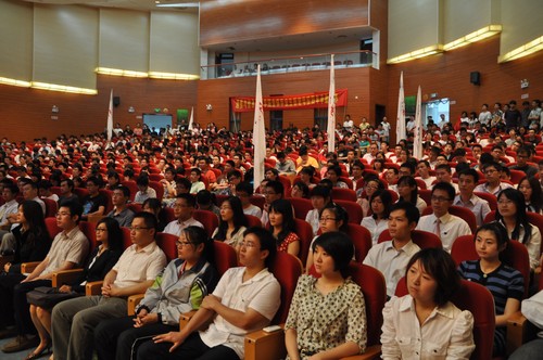 6月17日下午四点,我校2011届本科生毕业典礼在大学生活动中心青春剧场隆重举行。虽然天公不作美,降起了瓢泼大雨,但大雨不能抵挡毕业生们的满腔热情,怀着对母校的眷恋和对未来的憧憬,他们蜂拥而至,身着个性十足的毕业T恤,手持所在学院的旗帜,参加这场大学时代最有意义的仪式。