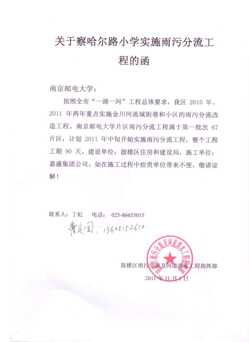 关于察哈尔路小学实施雨污分流工程的函