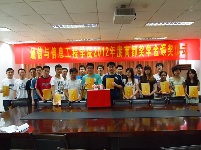2012年6月19日上午,通信与信息工程学院2012年南都毕业生奖学金颁奖仪式在科技楼208会议室举行。学院副院长刘峰教授,浙江南都电源动力股份有限公司党委书记王红、中国市场副总监高广峰、办公室副主任傅翔出席,20名获奖毕业生参加,学院党委副书记黄婷婷主持仪式。学院领导和南都公司嘉宾为获奖同学颁发了南都奖学金获奖证书,并合影留念。 颁奖仪式结束后,学院20位获得2012年南都奖学金的毕业生延承2010、2011连续两年捐资助学的良好传统,举行了爱心捐赠仪式,将所得部分奖金捐赠给学校彩虹助学专项基金,共计贰仟圆整,为帮助家庭困难学弟学妹们顺利完成学业尽一份力。