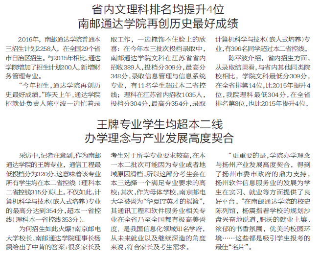 【扬州时报】南邮通达学院招生再创历史最好成绩