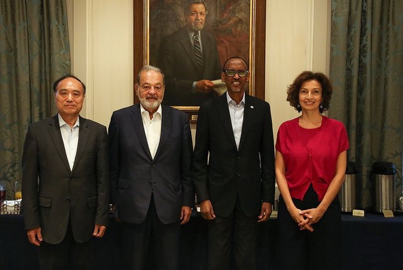9月23日,联合国宽带可持续发展委员会主席副主席在纽约合影。左起为国际电联秘书长赵厚麟,墨西哥富商卡洛斯先生,卢旺达总统,联合国科教文组织总干事