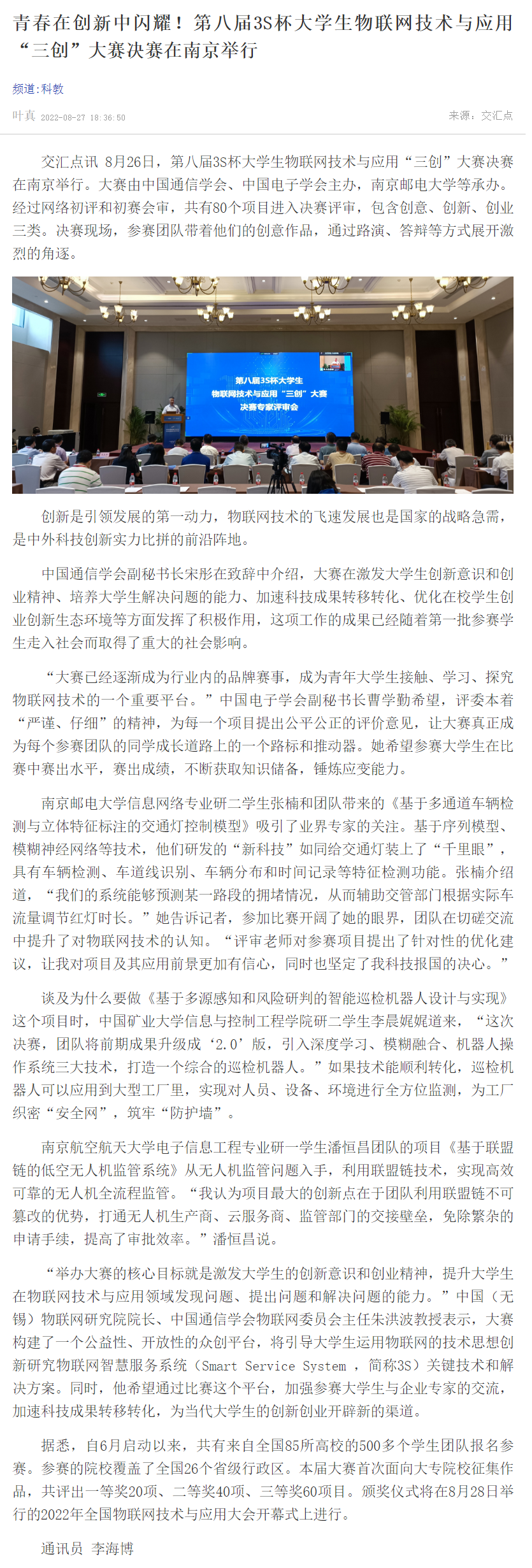 【新华日报客户端】青春在创新中闪耀!第八届3S杯大学生物联网技术与应用“三创”大赛决赛在南京举行