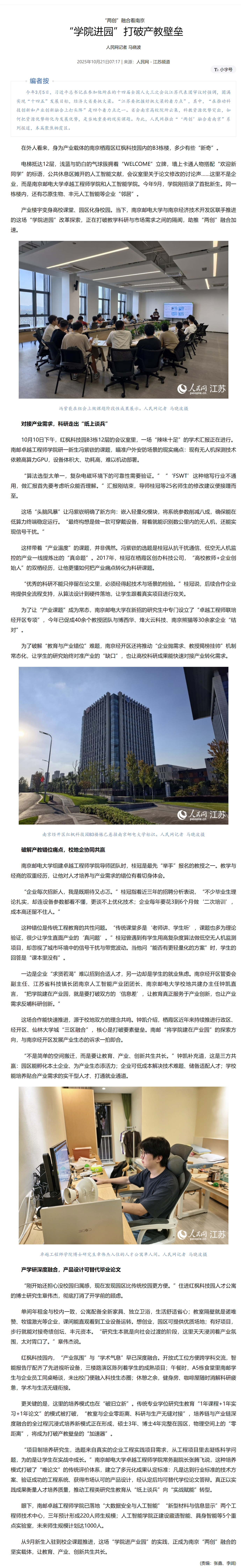 【人民网】“两创”融合看南京 “学院进园”打破产教壁垒