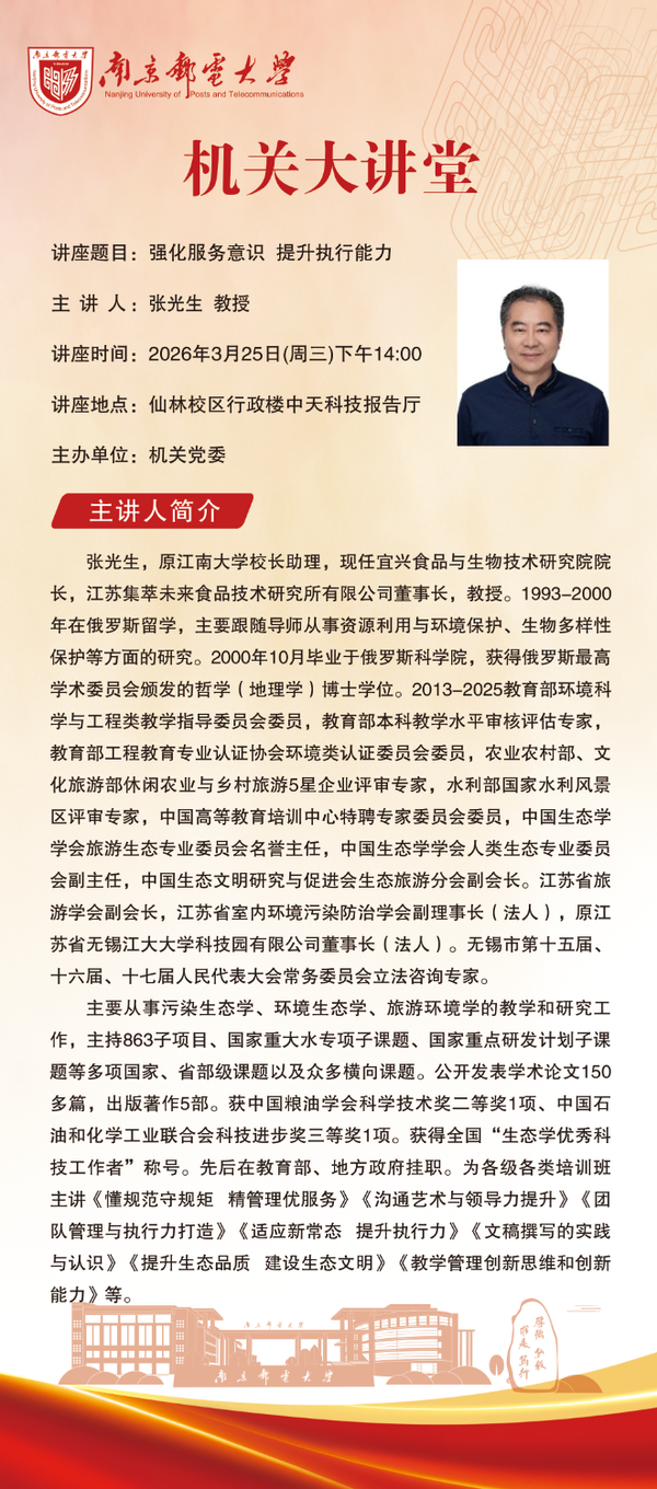 机关党委于3月25日下午14:00举办机关大讲堂,邀请原江南大学校长助理张光生教授做主题为《强化服务意识 提升执行能力》辅导报告。欢迎师生参加。