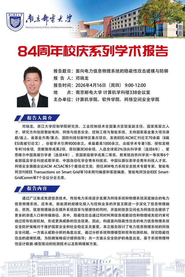 浙江大学邓瑞龙研究员学术报告:面向电力信息物理系统的隐蔽性攻击建模与防御