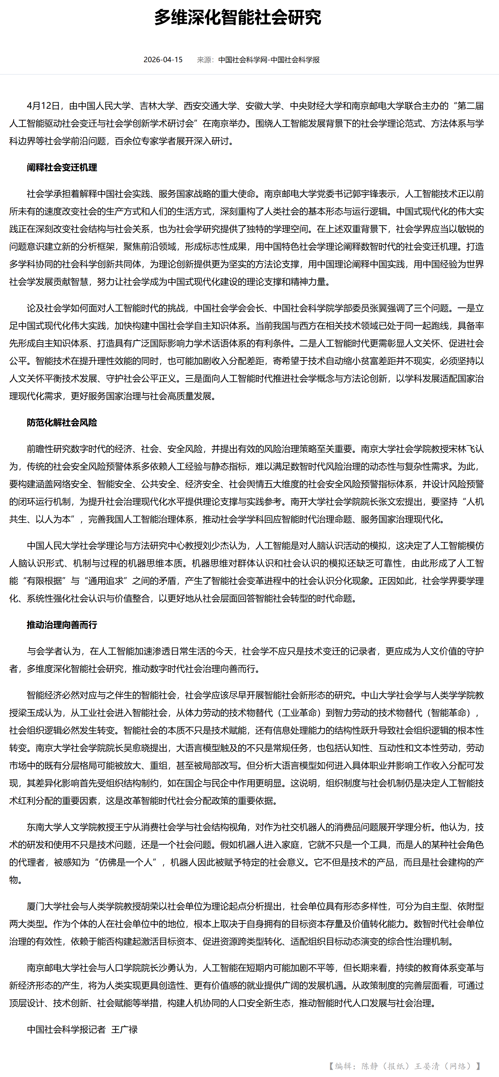 【中国社会科学报】多维深化智能社会研究