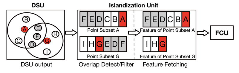 当前,大多数点云加速器侧重于开发专用的特征图收集单元,并采用NPU执行特征计算。由于点云神经网络中特征图之间存在大量重复点,导致点云加速器的NPU工作负载中存在大量重复访存和计算。研究团队借鉴图神经网络(GCN)加速器设计中跨特征图数据复用的思想,提出一种软硬件协同设计方法(L-PCN)来开发点云网络的空间局部性:软件上提出“岛屿化步骤”,可为点云模型带来最高93.8%的访存降低和最高80.6%的计算降低;硬件上设计“岛屿化单元”并自然集成到现有的点云加速器中,可额外提供最高3.2倍的加速。该工作在速度与精度保留方面均优于现有的点云特征计算优化方法。