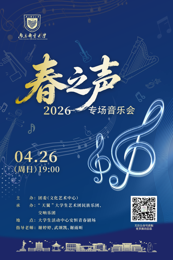 为深入贯彻教育部《关于全面实施学校美育浸润行动的通知》和《关于全面推进健康学校建设的指导意见》,践行“健康第一”教育理念,团委(文化艺术中心)将于4月26日(周日)19:00在仙林校区青春剧场举办“春之声”专场音乐会。本场音乐会由南京邮电大学“天翼”大学生艺术团民族乐团、交响乐团联袂演出。