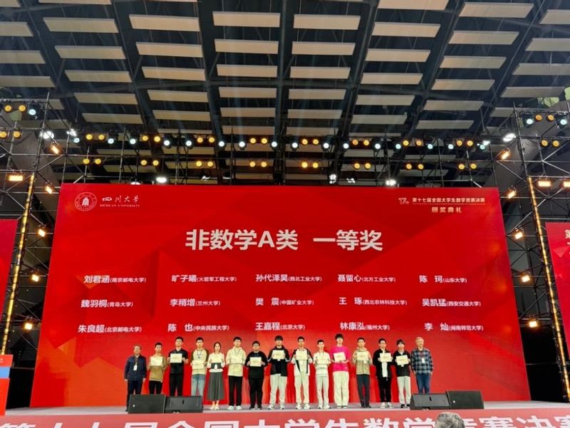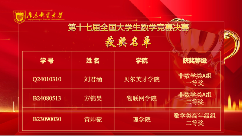 4月19日,第十七届全国大学生数学竞赛决赛在成都落幕。南京邮电大学贝尔英才学院刘君涵同学获非数学A类一等奖,物联网学院方锦昊同学获非数学A类二等奖、理学院黄帅豪同学获数学类高年级组二等奖。