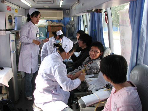 自接到南京市血液中心来我校进行无偿献血活动的通知后,学校党委给予了高度重视,叶美兰副校长主持召开献血工作协调会,要求各相关职能部门及各学院党委、党总支给予高度重视和大力支持,各学院要认真细致地做好宣传发动工作,同时重视献血者的营养补充,提高营养餐的标准,做好后勤保障工作。学生处做好献血同学的营养餐的相关准备工作,后勤服务集团在做好营养餐的同时,还要确保提高免费营养汤的质量。保卫处、团委也分别做好现场志愿者服务和安全保卫工作,确保本次献血工作安全有序地进行,并充分体现学校的关怀。仅11月18、19日两天近8小时就有750名同学参加了无偿献血,采血总量达180000毫升,南二食堂广场上的采血现场成为我校精神文明建设的又一个新亮点。