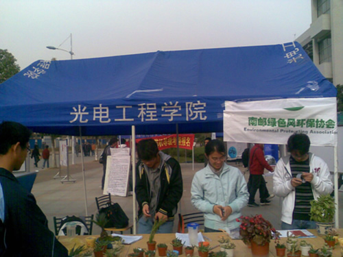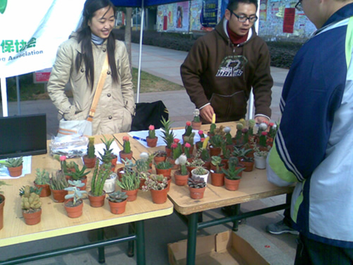 据研究表明,在寝室内放一盆如仙人掌、文竹、常青藤、秋海棠等植物,就可将空气中由电器、塑料制品等散发的一氧化碳、过氧化物等有害气体吸收掉,有很强的杀菌抑菌之力。一直致力于环保工作的我院“绿色风”协会在宣传环保知识的同时,统一采购了仙人掌、文竹、海棠、菊花等小型盆栽,以成本价提供给广大师生,由于物美价廉,活动受到广大师生的喜爱,纷纷驻足观看,挑选自己喜欢的植物,为冬天的校园增添一抹亮丽的颜色。