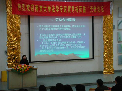 今年12月4日是我国的第八个普法日,为了让更多的大学生知法懂法,并利用法律知识更好地维护自身的合法权益,晚18:30分在仙林的特大教室由校党委宣传部和光电工程学院共同举办了第三期“光电论坛”,特邀了南京大学法学专家黄秀梅副教授做了题为《大学生就业权益维护与典型案例分析》专题讲座。讲座由校党委宣传部部长许公全老师主持,与会的有信息法律与知识产权研究所所长张振亮老师、光电工程学院党委副书记尹志丽老师和光电工程学院部分辅导员,400多名学生聆听了讲座。