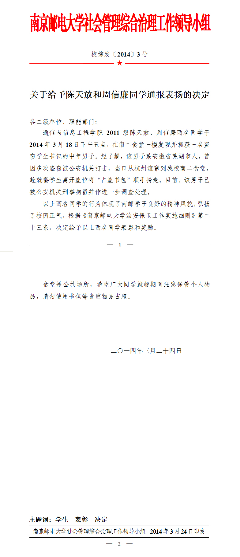 | 发布时间: 2014-03-27 浏览次数: 2394 文章来源: 南京邮电大学社会管理综合治理工作领导小组 |