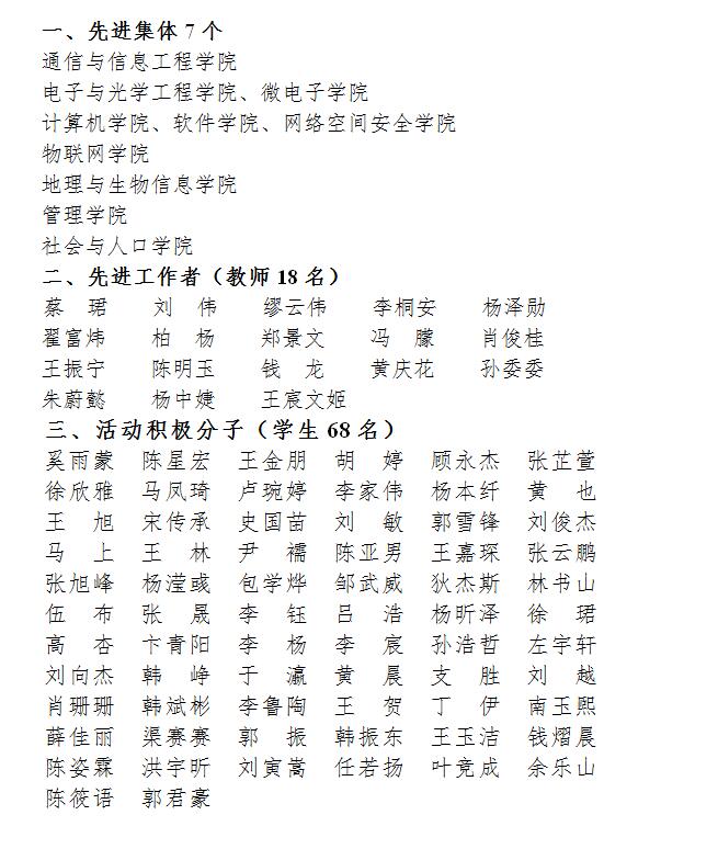 南京邮电大学校园治安综合治理工作领导小组 2018年6月29日 附件: 第五届“学生安全教育月”活动先进集体、先进工作者和活动积极分子名单 |