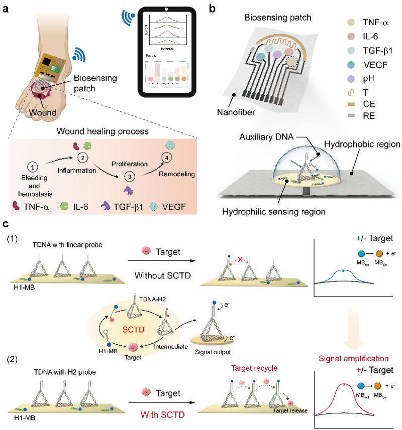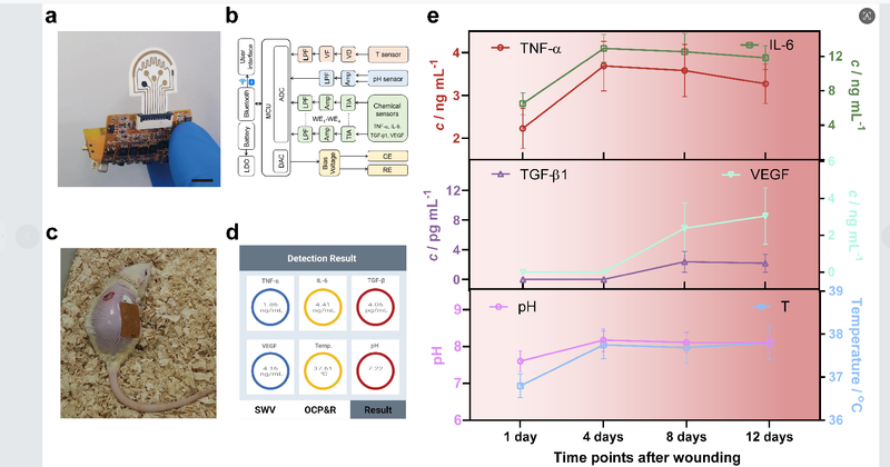 近日,南京邮电大学柔性电子全国重点实验室、化学与生命科学学院汪联辉教授和王婷教授团队在柔性电化学传感领域取得重要进展。该团队开发出一种新型柔性生物电子传感系统可实现伤口原位、实时、高保真和多模态监测。10月7日,相关研究成果以“Soft bioelectronics embedded with self-confined tetrahedral DNA circuit for high-fidelity chronic wound monitoring”为题,发表在国际学术期刊Nature Communications上。博士后赵晓为论文第一作者,汪联辉教授和王婷教授为论文的共同通讯作者。 慢性伤口的评估与治疗是临床医学的一大挑战。伤口处的蛋白质,特别是炎症相关蛋白,是判断愈合进展的关键“信使”。然而,这些蛋白质生物标志物在伤口渗出液中浓度极低,且伤口环境复杂,导致现有生物传感器普遍面临以下难题:灵敏度不足、易受人体活动干扰、长期使用性能下降且易被污染。针对上述伤口生物传感面临的问题,汪联辉教授和王婷教授团队开发了一种自限域四面体DNA循环放大电路(SCTD)嵌入式柔性生物传感器用于全面、高保真监测伤口各阶段特异性蛋白质和生物物理指标(图1a)。借助图案化润湿性纳米纤维贴片实现伤口渗出液富集并防止辅助DNA扩散,从而在不妨碍伤口愈合的情况下形成亲水性生物传感反应池(图 1b)。SCTD通过外源辅助核酸预固定策略和空间限域策略实现目标蛋白质触发的SCTD信号放大(图1c),将检测限降低一个数量级。四面体DNA结构确保了高保真检测,测试表明即使在1000次弯曲循环后,信号变化仍在3%以内;4周内信号衰减低于8%;同时,其抗生物污染能力也提升了超过50%,能有效抵抗伤口复杂环境的干扰。 基于核酸级联扩增的可穿戴柔性生物传感系统用于原位慢性伤口监测示意图 结合无线通讯模块,该平台可同时监测多种伤口愈合相关蛋白质(TNF-α、IL-6、TGF-β1和VEGF)以及pH值、温度等关键生理参数(图2a-c)。该无线传感平台可在不会妨碍愈合情况下实现对糖尿病小鼠未感染伤口和感染伤口准确、原位监测(图2d, e)。相较于传统伤口监测手段,该柔性传感系统提高了灵敏度和稳定性,同时能够实时、多参数检测,未来有望基于分子特征指导治疗决策,并与智能敷料集成实现响应式治疗。 可穿戴传感系统在糖尿病小鼠模型中对慢性伤口原位监测 该工作得到国家自然科学基金优秀青年项目、国家自然科学基金青年项目、江苏省卓越博士后项目、南京邮电大学引进高水平师资科研启动项目等多个项目支持。 (撰稿:赵晓 初审:乔祖琴、戴修斌 编辑:王存宏 审核:张丰) |