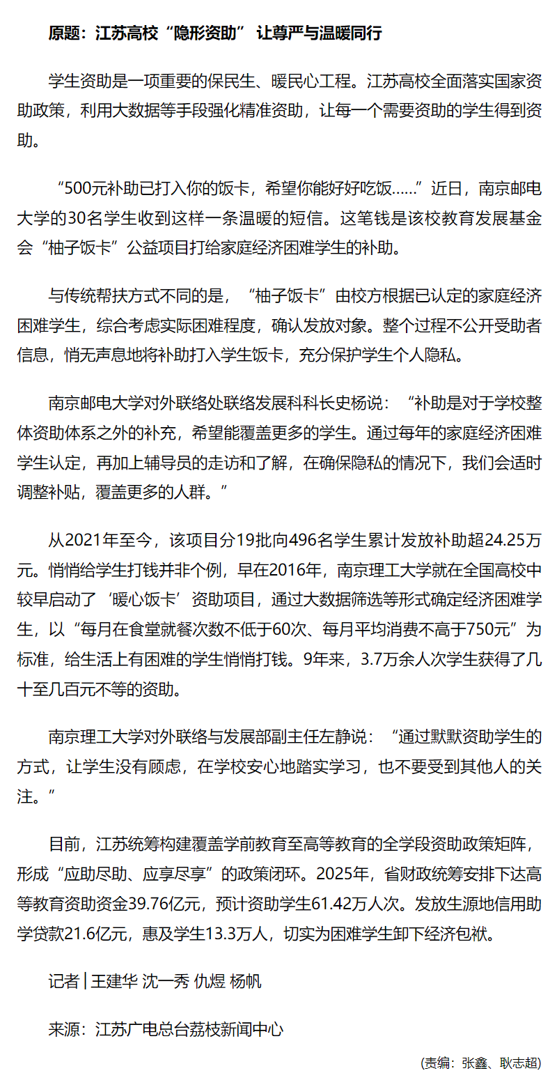 | 【人民网】江苏高校“隐形资助”让尊严与温暖同行 |