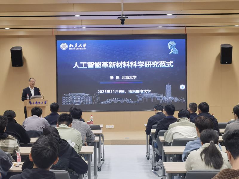 11月9日下午,中国科学院院士、北京大学常务副校长、博雅讲席教授张锦应邀到南京邮电大学“FlexMat柔性电子材料前沿论坛”开展学术交流,作题为“人工智能革新材料科学研究范式”学术报告。材料科学与工程学院、化学与生命科学学院教师、研究生、本科生等200余人聆听报告。 张锦在报告中以“AI for Science”为核心命题,介绍了AI加速基础研究的范式和路径。他指出,基础研究作为人类认知边界的拓荒者、国际竞争格局的塑造者、经济社会发展的引擎,正面临三重挑战:研究体系呈现指数级复杂度、数据标准亟待统一、创新链条存在显著断层。而人工智能技术凭借其在高维数据解析中的降维能力、多尺度建模中的关联挖掘优势,正为基础研究注入全新动能,推动科研范式从经验驱动向数据驱动的革命。他以AI赋能材料设计、制备和产业化等研发实践为例,指出构建具有中国特色的AI发展路径需实现双轮驱动:既要突破传统科研范式的思维定式,建立跨学科协同的创新机制;更要打造面向重大科学问题的智能平台,通过AI+科学装置的深度融合,构建从数据采集到知识发现的闭环体系。