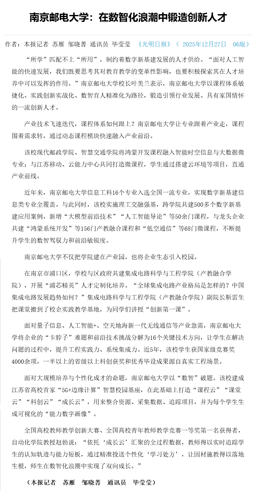 | 【光明日报】南京邮电大学:在数智化浪潮中锻造创新人才 |