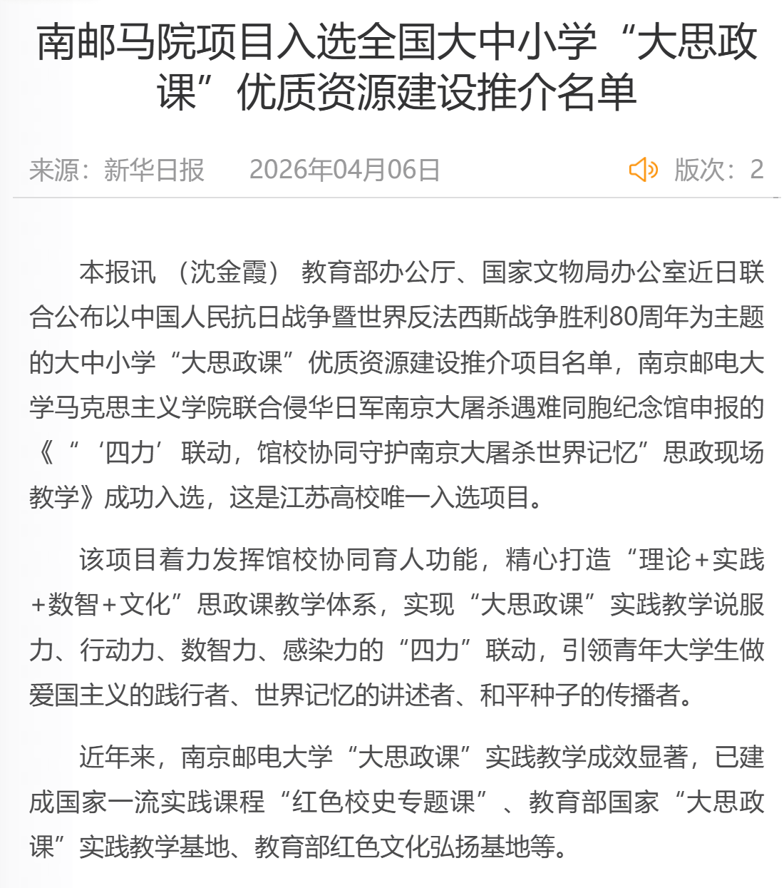 【新华日报】南邮马院项目入选全国大中小学“大思政课”优质资源建设推介名单