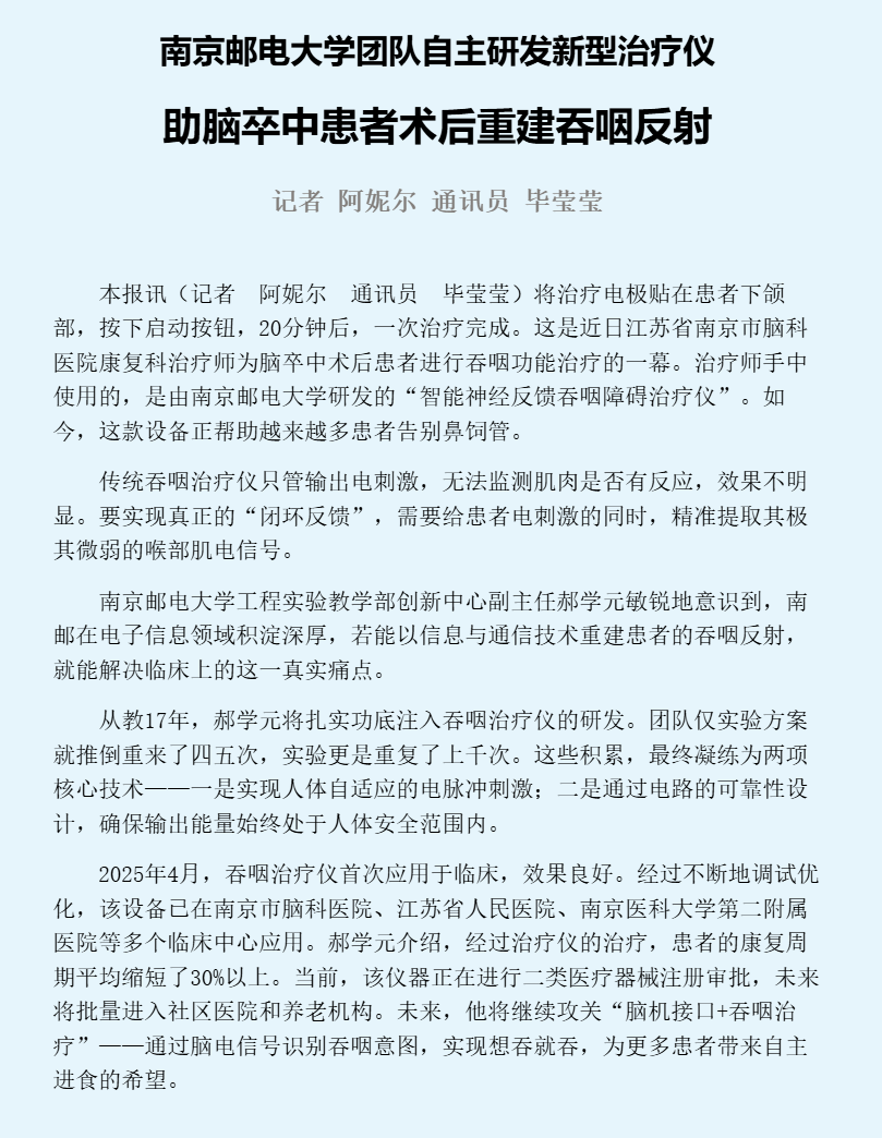 【中国教育报】南京邮电大学团队自主研发新型治疗仪 助脑卒中患者术后重建吞咽反射